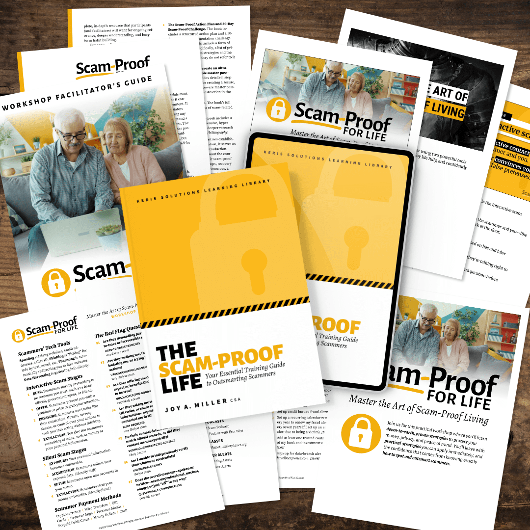 A copy of The Scam-Proof Life (paperback or ebook format) is included in this bundle as it is required to use the workshop companion materials. If you already own a copy of The Scam-Proof Life, you can purchase the materials alone when you provide proof of purchase.